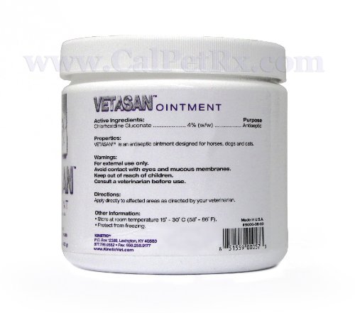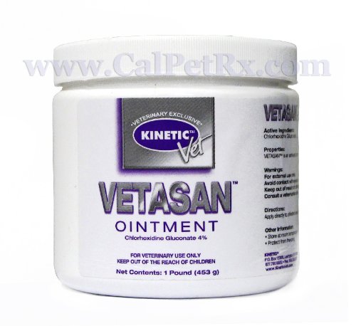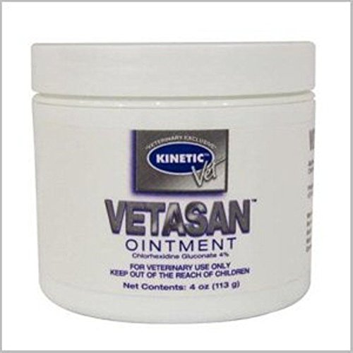 Product DescriptionVetasan Chlorhex Ointment This topical antimicrobial ointment is formulated for used on surface wounds in cats, dogs and horses. Active ingredient: chlorhexidine gluconate 4%.0