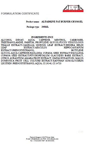 -. Feature : Freeze your cellulite away with Altadrine fat burner cryogel. Treat the problems of cellulite and water-retention by burning the fat and activating the microcirculation. Some areas of the body have a tendency to accumulate fat (abdomen, hips, thighs, buttocks) and this is where Altadrine cryogel acts. / ACTIVE FORMULA ► Citrus aurantium → Converts fat into energy ◘ Caffeine → Converts fat into energy ○ Aesculus hippocastanum → Strengthening veins and capillaries ♦ Stem cells → Stimulates the secretion of the protein that burns and destocks fat / INDICATIONS Patients suffering from cellulite (effective on the 3 types of cellulite) and water-retention problems / KEY POINTS The cold effect of the cryogel is very effective when applied and the cold sensation is felt immediately and for a long time when compared to competitors Very good value for money A 2 in 1 treatment to treat the problems of cellulite and water-retention Extracts enhancing microcirculation, diminishing the circumference of the thighs and cutting out muscles. The anti cellulite activator + Pure Caffeine + citrus aurantium, to enhance burning and destock of fat deposits. Stem cells capable of stimulating the secretion of the protein that burns and destocks fat. Efficacy Clinically Tested: Imperfections caused by cellulite visibly reduced. The silhouette is significantly refined; Altadrine Gel cuts out muscles.