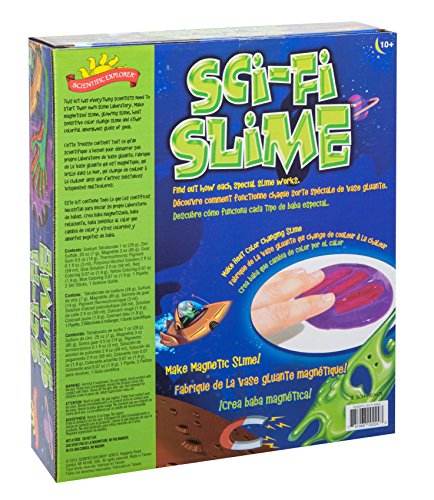 Scientific Explorer Sci-Fi Slime is the supreme slime lab for the budding scientist. Make some of the strangest, most anomalous slime you've ever encountered! Weird slime that changes color with the heat of your hands. Magnetic slime that slithers towards magnets. Even slime that glows eerily in the dark. Learn the science behind these amazing hydrophilic polymers while mixing up gobs and gobs of slime. Includes tetraborate, zinc sulfide, magnetite, guar gum, thermochromic pigment, polyvinyl alcohol solution, glue solution, red, yellow and blue coloring, 1 pipette, 2 stir sticks, and a science guide. Recommended for children 10 years of age and older with adult supervision.Feature