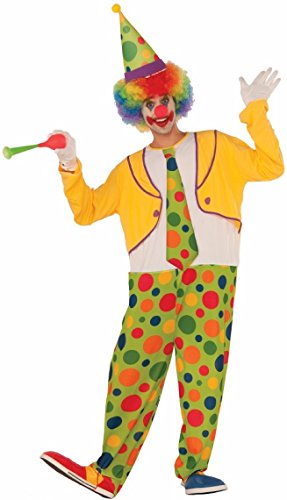 -. Binding : Apparel -. Brand : Forum Novelties -. Department : mens -. Feature : Clown costume includes hat and jumpsuit with attached jacket and tie / Features colorful polka dot pants, tie and hat and bright yellow jacket / Standard size fits up to a 42-inch chest / Rainbow wig, clown shoes, makeup, and other Circus accessories available separately / Made by Forum Novelties, a leader in costumes and novelty products for more than 30 years -. IsAdultProduct : 0 -. Label : Forum Novelties Costumes -. Manufacturer : Forum Novelties Costumes -. Model : 76425 -. PackageQuantity : 1 -. ProductGroup : Apparel -. ProductTypeName : ADULT_COSTUME -. Publisher : Forum Novelties Costumes -. Studio : Forum Novelties Costumes -. Title : Forum Men's Hoopy The Clown Costume