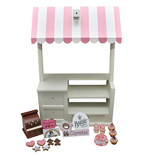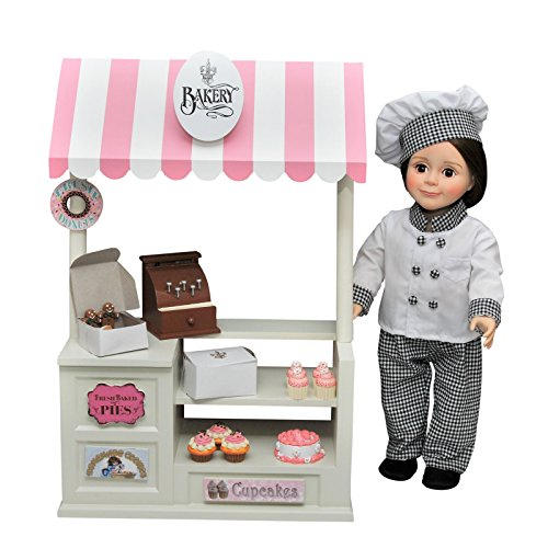 A total value of $146.95 if purchased separately! Complete 18 inch Doll Bakery Shoppe stocked with delicious looking baked goods, "real" bakery boxes, a register and even money! Shoppe Includes Counter, canopy, 5 (interchangeable) signs, cash register with money, 6 assorted cookies, set of 3 large muffins, a party cake and set of 3 mini cupcakes. Also included is 4 authentic looking bakery boxes. Includes everything needed for your little entrepreneur to enjoy hours of creative play. Signs are interchangeable to create multiple themed Shoppes (such as "Pizza Queen" ,"Royal Tea Room", "Cinderella's Shoe Shoppe" (SOLD SEPARATELY). Exclusively made by The Queen's Treasures®, offering the highest quality 18 inch Doll Furniture, 18 inch Doll Clothes, 18 inch Doll Shoes & 18 inch Doll Accessories! Safety Tested!Feature