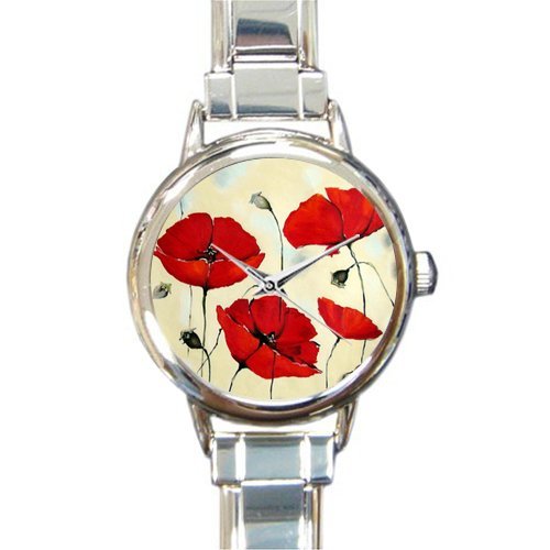 -. Title : Personalized Watch Classic Poppy Flower Art Design Round Italian Charm stainless steel Watch