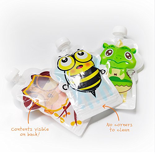 -. Feature : Cartoon Animal Design:perfect size and shape for all ages. Cartoon animal character encourages your children to eat more. / Easy to Use & Clean: wide bottom opening easy to fill and clean. Dual-zipper prevents the leak effectively. It is durable and Long Lasting style. / Dishwasher Safe & Freezer Safe: Just fill, store, wash, reuse! save time and money as well as more secure. / Storable & Portable: cute pouch is easy for baby to hold and squeeze. Carry for ease and enjoy it anytime anywhere. 8-pack meet a variety of needs. SATISFACTION GUARANTEED / Material: PEL + LLDPE Food Grade Material, Radiation Sterilization! Phthalate Free, Latex Free, Lead Free, BPA Free!