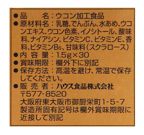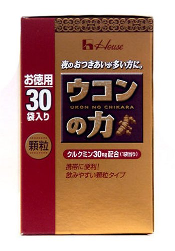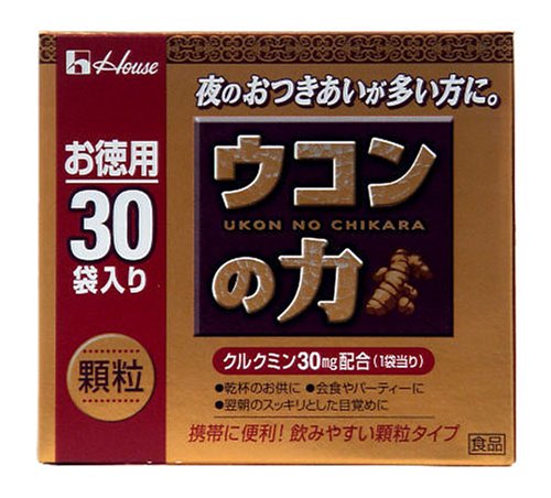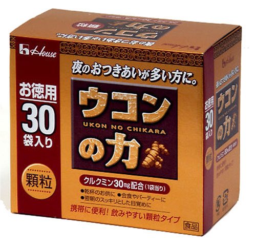 -. Binding : Health and Beauty -. Brand : UKON NO CHIKARA -. EAN : 4902402804964 -. Feature : Package contains 1.5g x 30 bags / Each bag contains 30mg of curcumin / Recommended to take one bag with water before drinking -. IsAdultProduct : 0 -. Label : House Foods Corporation -. Manufacturer : House Foods Corporation -. MPN : na -. PackageQuantity : 1 -. PartNumber : na -. ProductGroup : Book -. ProductTypeName : HEALTH_PERSONAL_CARE -. Publisher : House Foods Corporation -. Studio : House Foods Corporation -. Title : House UKON NO CHIKARA Turmeric Granules 30mg Curcumin per Bag | 1.5g x 30 bags