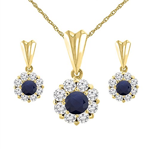 -. Title : 14K Yellow Gold Natural Blue Sapphire Earrings and Pendant Set with Diamond Halo Round 4 mm
