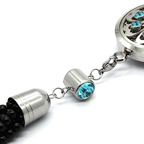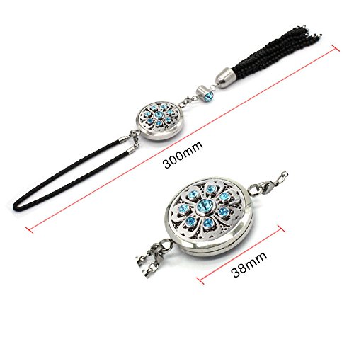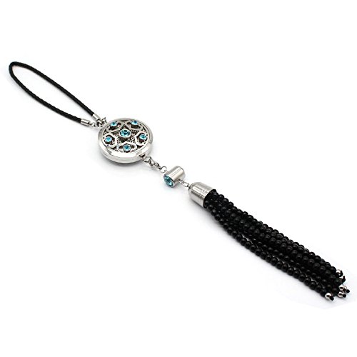 COOHAA sunflower car essential oils that symbolize luck,enthusiasm and light. Handmade black agate tasselS with sky blue crystals locket and black leather hanging loop making it easy to install on your mirror!