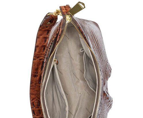 -. Feature : Gorgeous embossed leather with brass hardware / Measures approx. 12.5 inch x 13.5 inch x 5 inch / Convenient shoulder strap with 10 inch drop length / Zip top closure. Brahmin brass charm; exterior back slip pocket / Fully lined interior with multifunction pockets; key hook