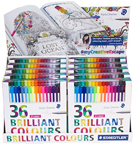 -. Feature : 10 x STAEDTLER Triplus Fineliner 36 Pack in BRILLIANT COLORS, Jumbo-Pack; 0.3 mm Fine Point, Assorted, DRY SAFE, Minimal Bleed Thru/Acid-free Ink. / Fineliner with superfine, metal-clad tip and ergonomic triangular shape for relaxed and easy writing. / DRY SAFE - can be left uncapped for days without drying up (Standard atmosphere according to ISO 554, except neon colours). / Line width approx. 0.3 mm. Water-based ink. Washes out of many textiles. / 10 PACK : Staedtler Color Pen Set, 10 Sets of 36 Assorted Colors. Packaged in cardboard box.