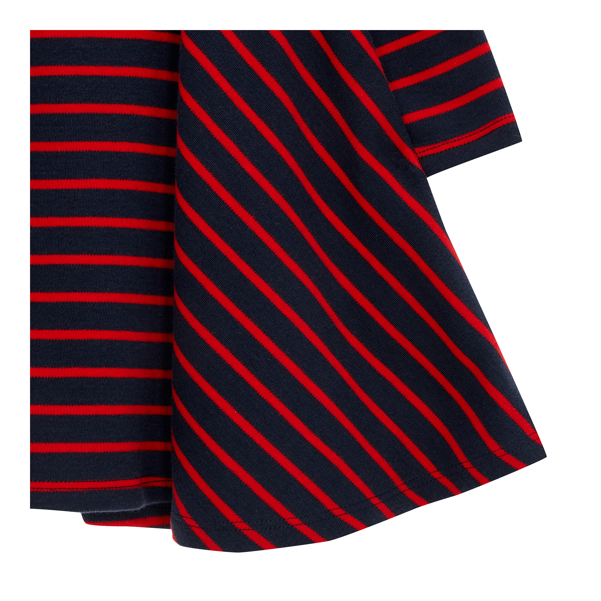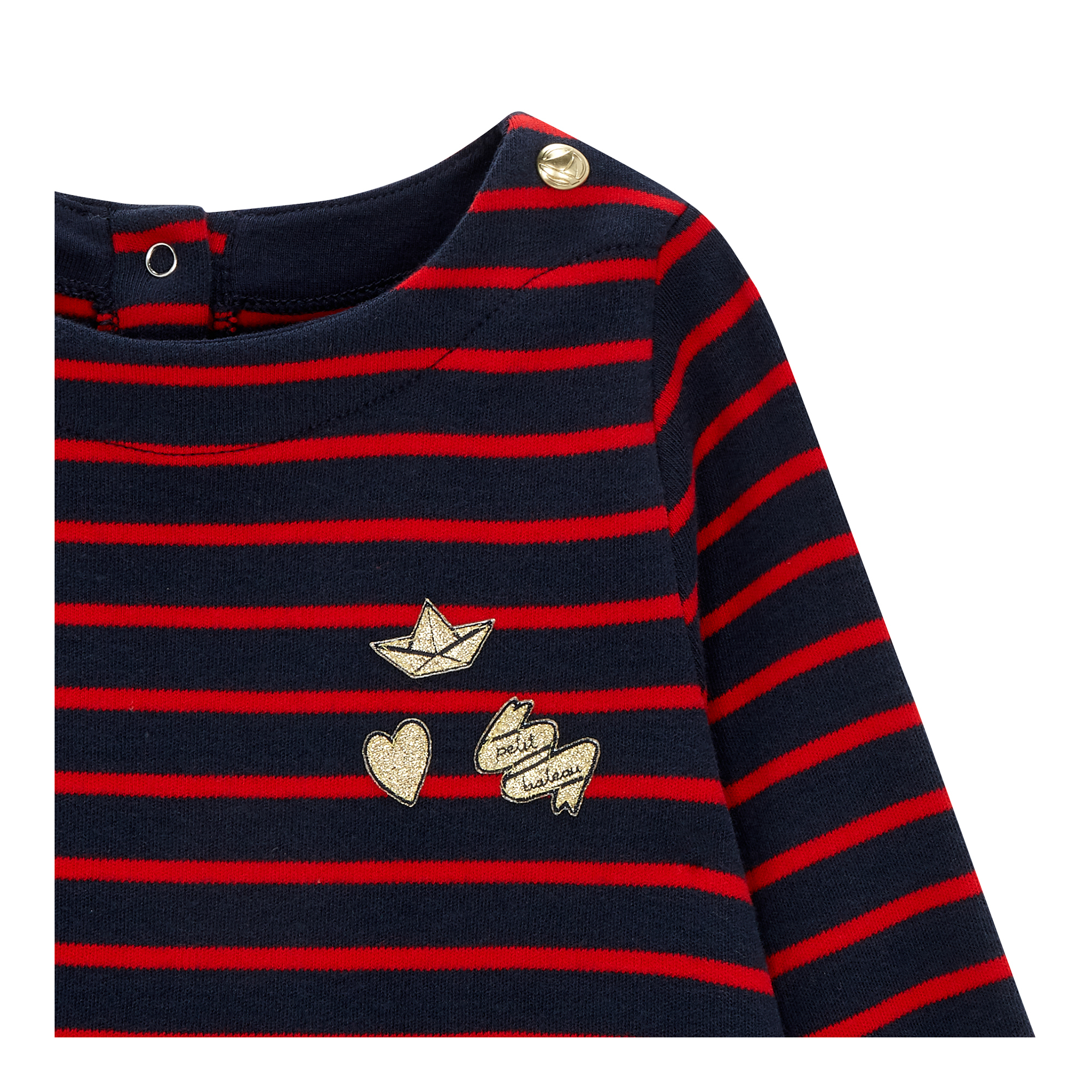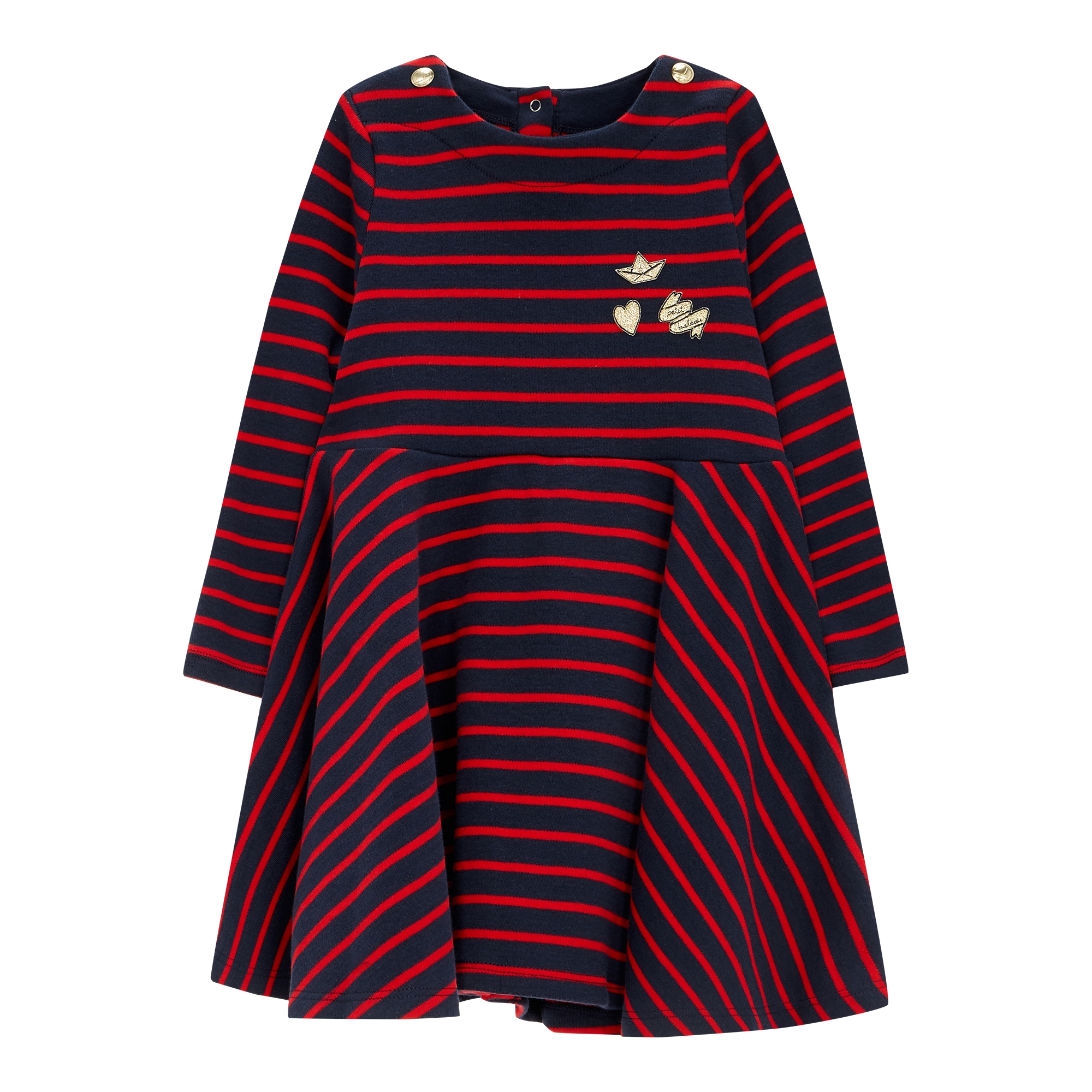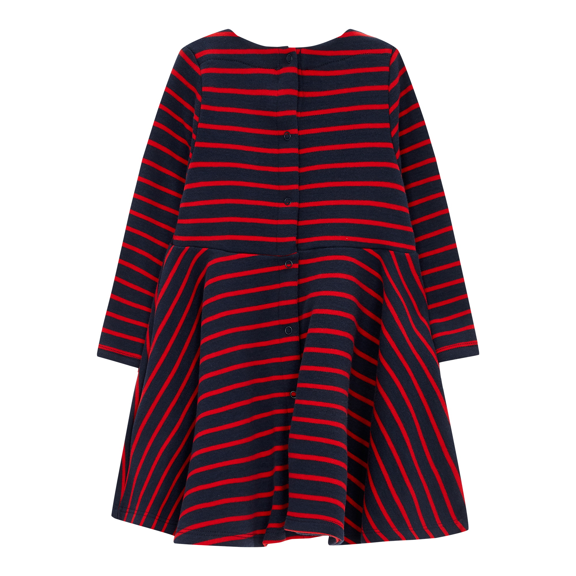 컬렉션 : 2017 Fall/Winter 디자인 포인트 : - 쁘띠바또 아이코닉 스트라이프 패턴 디테일이 돋보이는 원피스- 플레어핏 디테일로 여성스러운 느낌을 주는 디자인- 금색의 와펜 장식 디테일로 포인트를 더한 아이템 스타일링 추천 : 베이직한 가디건과 플랫슈즈 등을 매치하여 귀여운 페미닌룩 스타일링을 할 수 있음