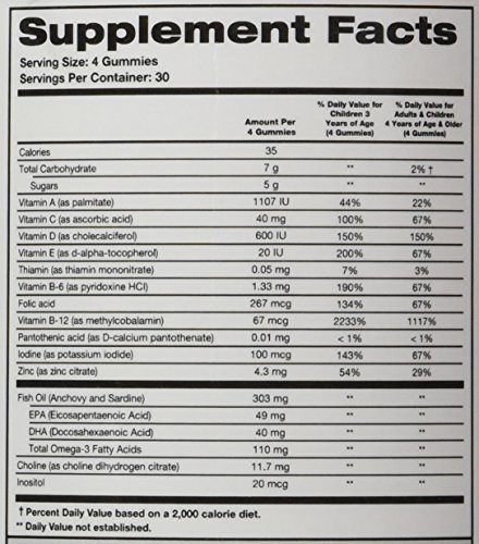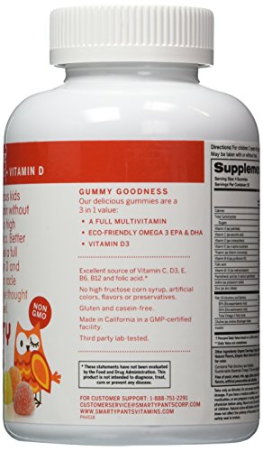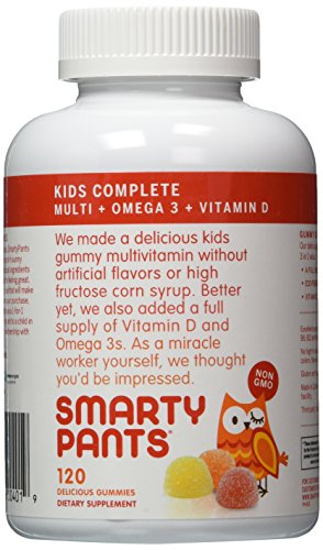 -. Binding : Health and Beauty -. Brand : SMARTYPANTS -. EAN : 0799804600355 -. Feature : SmartyPants now has 50% more Vitamin D3 / No High Fructose Corn Syrup, No Artificial Sweeteners / Our fish oil comes exclusively from small fish sources which eliminates mercury risk and avoids depleting salmon or tuna populations / Made in California with natural flavors and colors; Gluten and Casein free -. Label : SMARTYPANTS -. Manufacturer : SMARTYPANTS -. MPN : 113742-1-240 -. PackageQuantity : 1 -. PartNumber : 113742-1-240 -. ProductGroup : Health and Beauty -. ProductTypeName : HEALTH_PERSONAL_CARE -. Publisher : SMARTYPANTS -. Size : 240 -. Studio : SMARTYPANTS -. Title : SmartyPants Children's All-in-One Multivitamin Plus Omega-3 Plus Vitamin D 120 Gummies (Pack of 2) -. UPC : 799804600355