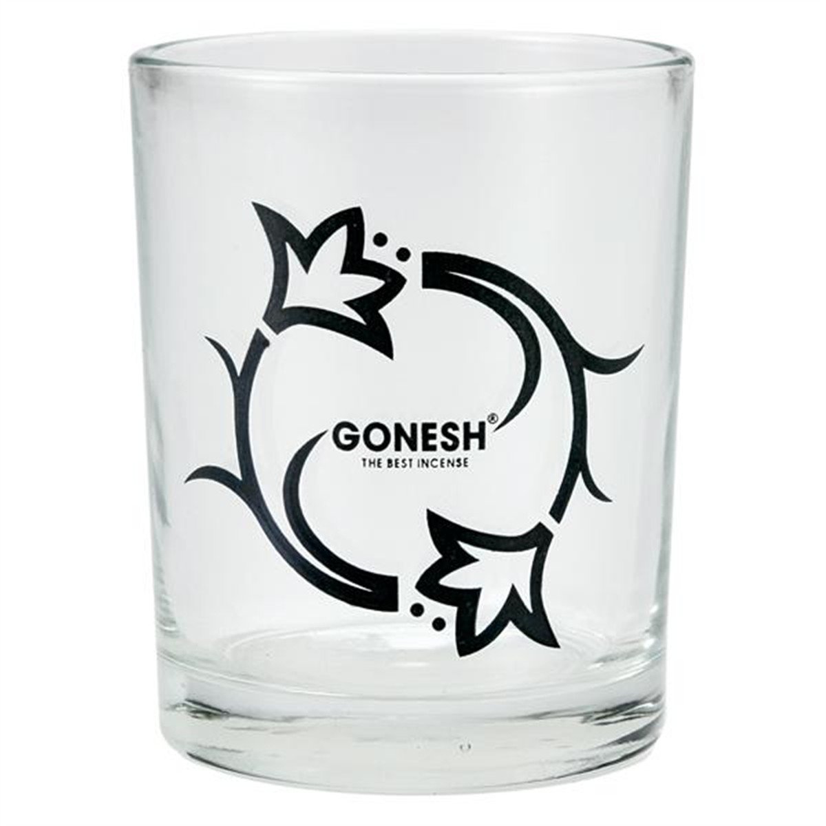 A clear glass candle holder with a black logo of sophisticated cool image.