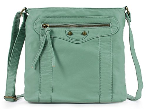 -. Feature : Ultra soft synthetic washed vegan leather with fabric lining. / Modern bronze-toned hardware. / Interior cell phone pocket, multifunctional slip and side zipper pocket. / Adjustable shoulder strap drops 23". / Size: 10.5"x9.5"x2"