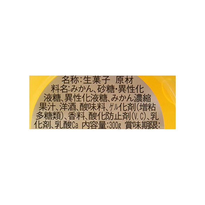 원재료:귤,설탕 이성화 액당,이성화 액당,귤 농축 과즙,양주,신맛료,겔화 제(증점다당류)고, 향료,산화 방지제(V.C)고, 유화 제,유산Ca