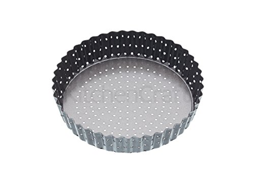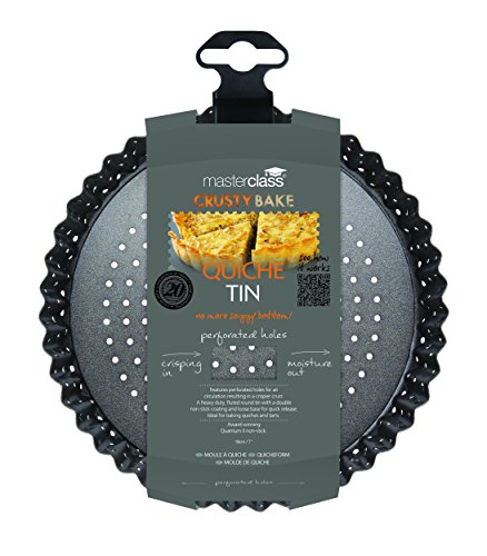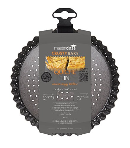 Studio : masterclass Publisher : masterclass Binding : Kitchen Product Description Make delicious quiches, flans and tarts with this non-stick, fluted round quiche tin. The perforated holes along the base and sides ensure the air circulates freely during the cooking process and you can create fruit flans and savoury quiches with the perfect golden-brown, crisp crust. Let's banish the soggy bottom forever! Various sizes available.