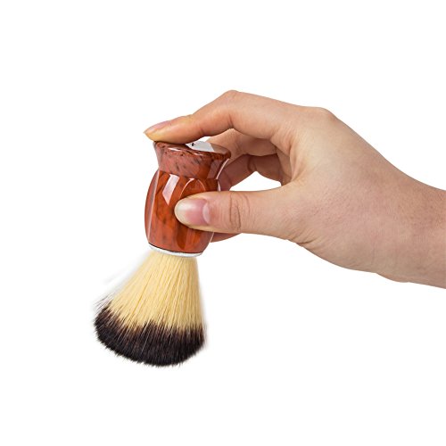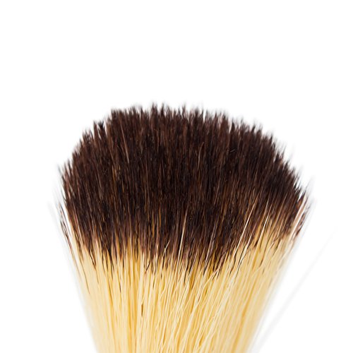 TWO TONED WOOD is extremely attractive, and is accented by a silver ring at the top of the handle, and a widened base to allow the user to set the brush down when not in use.