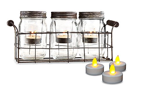 - 3 glass mason jars votive candle holder with rustic wire basket tray and 3 flickering tealight candles battery operated.