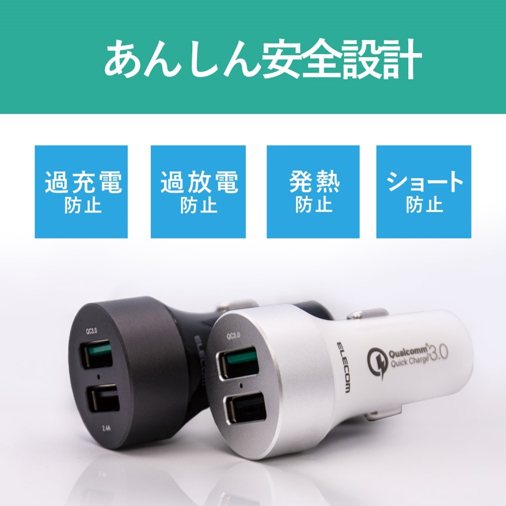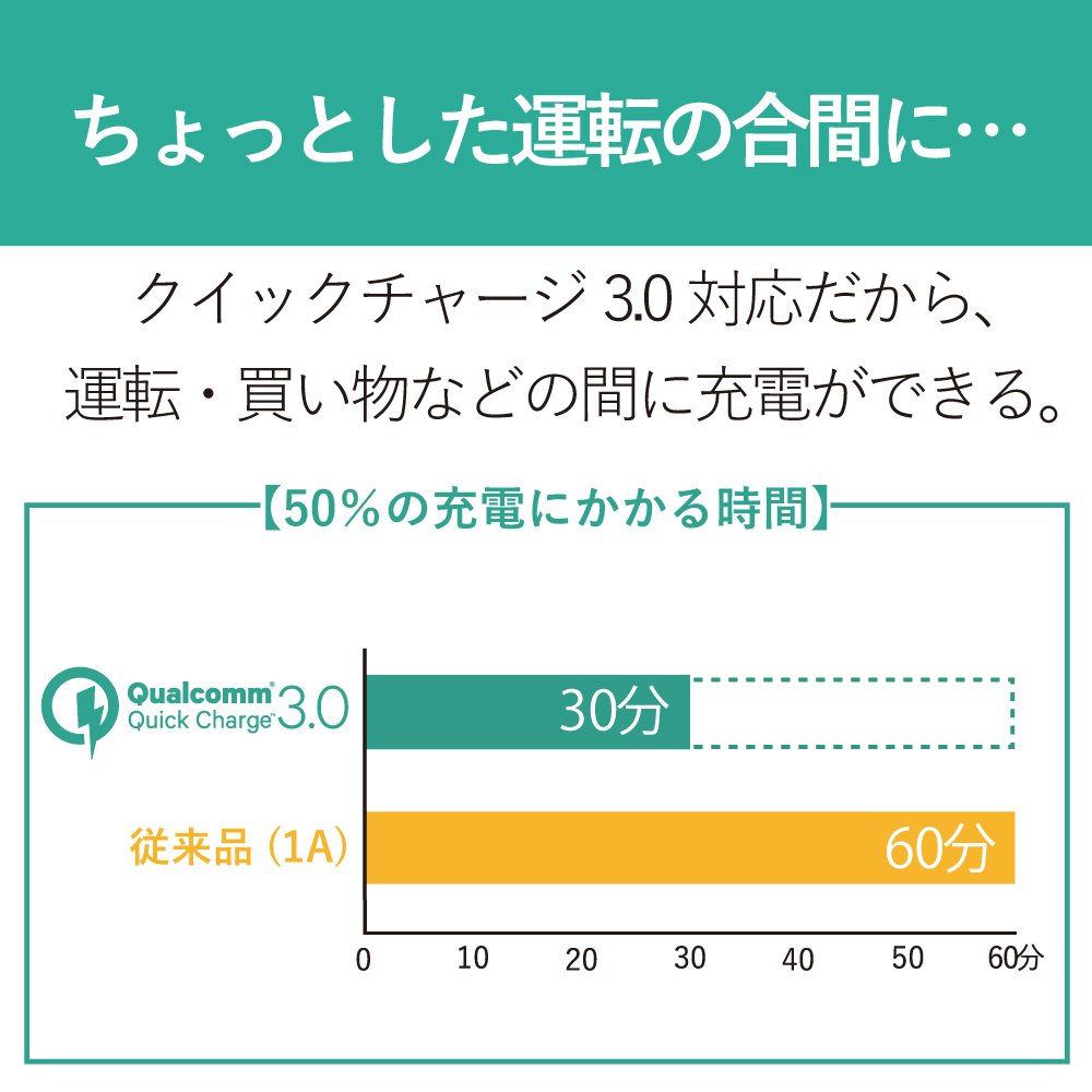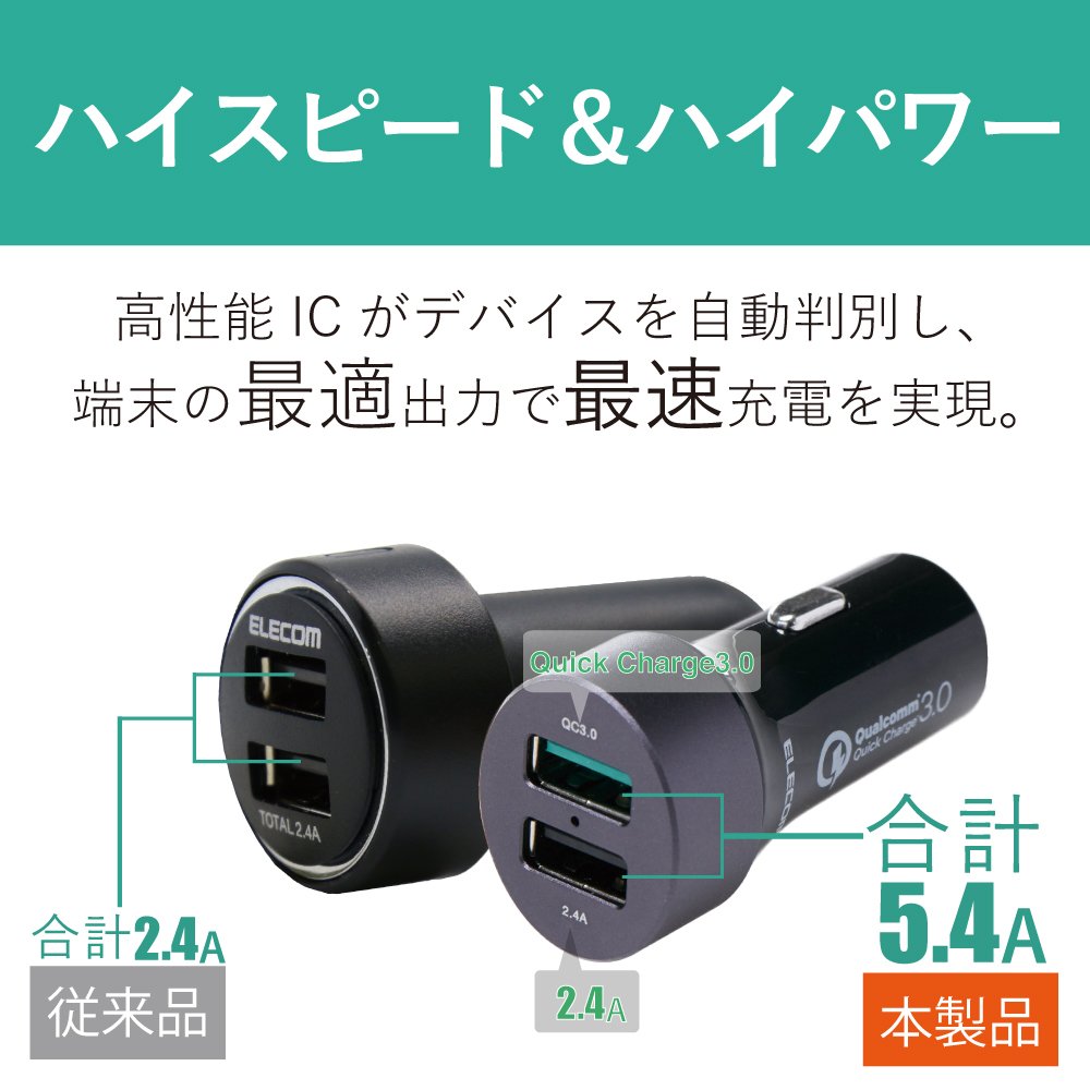 ■ It is an in-vehicle charger that can quickly charge Quick Charge (TM) 3.0 compliant smartphones from a car accessory socket via a USB port.