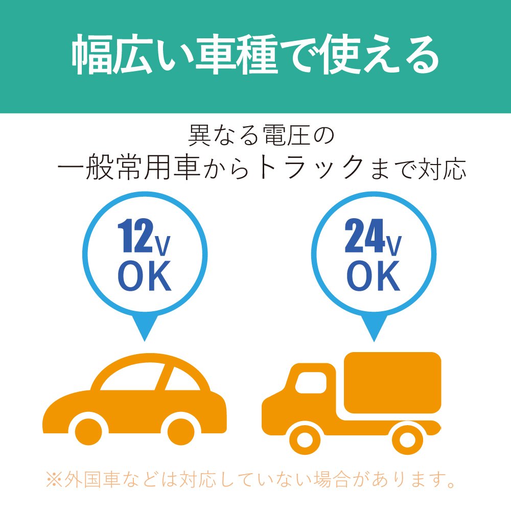 - It corresponds to 12V / 24V input, it can be used even for a large car such as a truck as well as a normal car.
