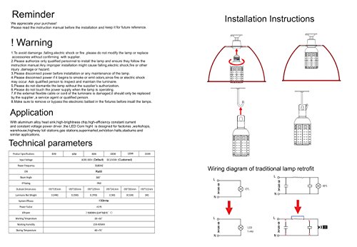 - WIDE APPLICATION: Unique design, energy saving, fast cooling, long service light, no humming, no flickering. Great for garage, driveway, warehouse, barn, patio, courtyard, garden, street, office, school, hospital, shopping mail, supermarket, station, restaurant, hotel, workshop etc, anywhere need bright light