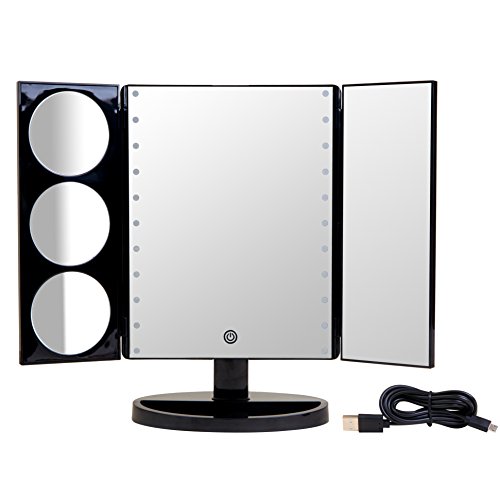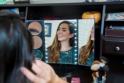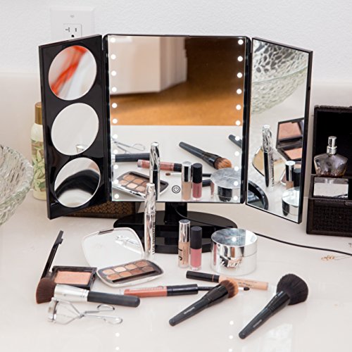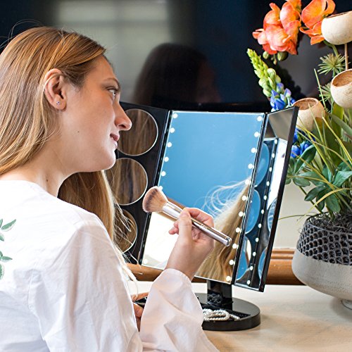 - + SOPHISTICATED YET SIMPLE + Gorgeous extra large lighted trifold makeup mirror with heavy NO-TIP base perches beautifully atop your vanity. Versatile, LED lit 1x, 3x, 5x and 10x mirrors allow you to SEE the FINEST DETAIL and your entire face, without wearing glasses!