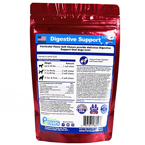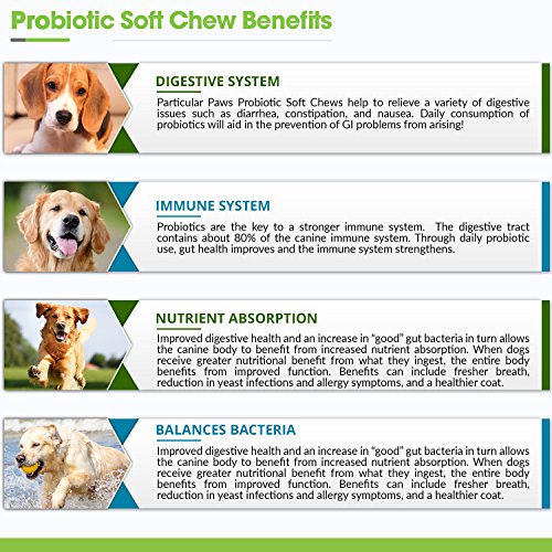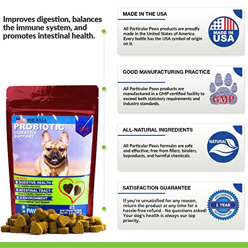 -. Feature : RETORES GI HEALTH: A cat or dog maintains healthy gut bacteria through the foods they eat, but these helpful bacteria are easily lost. Pets that have taken medications such as antibiotics, which kill all bacteria both good and bad, are often deficient in probiotics. A pet could also loose healthy bacteria when they are sick and have diarrhea, or take a laxative. Restore your pet_s healthy digestive bacteria with an all-natural, effective probiotic. / ALLEVIATE & PREVENT GASTROINTESTINAL ISSUES: Probiotics help alleviate a variety of intestinal issues including diarrhea, irritable bowels, nausea, bloating, and gas. Most pets develop these issues due to an imbalance in healthy bacteria in the gastrointestinal tract and are a sign that the body is having a difficult time digesting food. Given routinely, a probiotic supplement can aid in both treating and preventing these common GI upset problems in your pet. / IMMUNE SUPPORT: The gastrointestinal tract is where all the bodys absorption takes place. Nutrients and, unfortunately, bacteria as well as viruses are absorbed through the intestinal lining into the bloodstream. Introducing probiotics into the GI tract will help to reinforce the barrier of the intestinal lining. With a shield of healthy bacteria in place, your pet_s chances of developing an infection or immune related condition are substantially decrease. / DYNAMIC DIGESTION DUO: Our probiotic soft chews are unlike other pet probiotics because they contain both probiotics and prebiotics. Probiotics are a type of microorganism that live in the digestive tracts known as "good bacteria" or _helpful bacteria_ because they perform a variety of positive functions. Prebiotics are plant based fiber that _fuels_ the probiotics, allowing more to grow and function. / SATISFACTION GUARANTEED: We always offer a 100% no-hassle refund policy. Your dog_s health is our P.R.Imary concern. All Particular Paws products are created in a GMP-compliant facility proudly located in the U.S.A. Each product is developed under strict quality control guidelines overseen by veterinary experts.