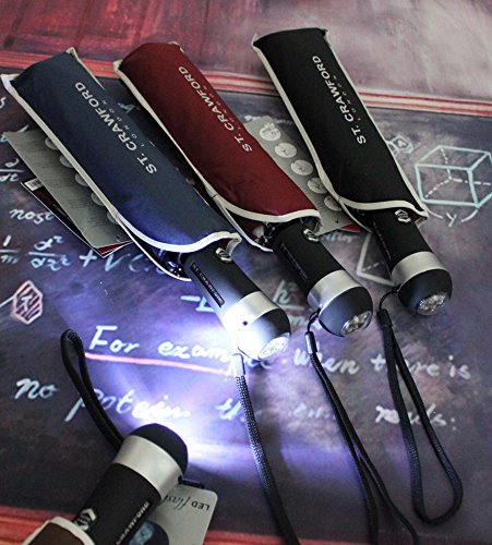 Studio : RECHAR Publisher : RECHAR Binding : Misc. Product Description 1. This auto triple folding umbrella will surely cheer you up in any dismal weather, the sample design style is suitable for business 2. Built in LED light in the handle is convenient and handy.Auto opening and closing - just press the button 3. This umbrella has multi function .You can use it in the sunny day , in the rainy day ,in the daytime ,even in the dark night.Just slightly press the button 4. LED flashlight can be rotating, remember to put the battery before use plastic sheets off 0