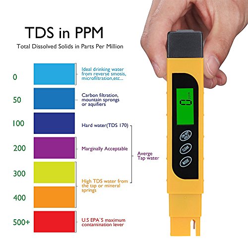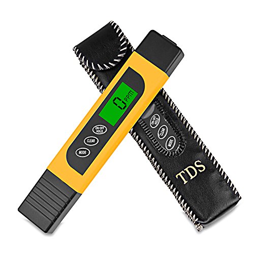 -. Feature : ★FEATURES: Made out of premium quality material, durable and waterproof; Small size with protective leather case for easy carry and storage; Measurement range of 0-9990ppm and 2% highly accurate, quick reading, various mode efficient in power saving / ★MULTIPURPOSE WATER TESTER: A TDS tester meter with 0-9999 ppm measurement range, +/- 2% readout accuracy, electrical conductivity measurement us/cm. Temperature display Fahrenheit or Celsius with accuracy +/- 1 degree. Also includes a nifty hold function that saves measurements for convenient reading and recording / ★QUICK READING: TDS meter with color back-light display function let you know immediately whether the water is qualified. GREEN DISPLAY: Less than 40ppm is OK for drinking. RED DISPLAY: More than 40ppm is unqualified for drinking / ★WIDE APPLICATIONS: For easy calibration of total dissolved solids and electrical conductivity whether in the home or in the garden. Suggested tool for household water, making colloidal silver, fresh water aquariums & aquaculture, ponds, livestock water, horticulture & hydroponics, and pools & spas. / ★PORTABLE SIZE: The small, slim size of Kyson high range and reliable TDS meter allows you to take it with you no matter where you go