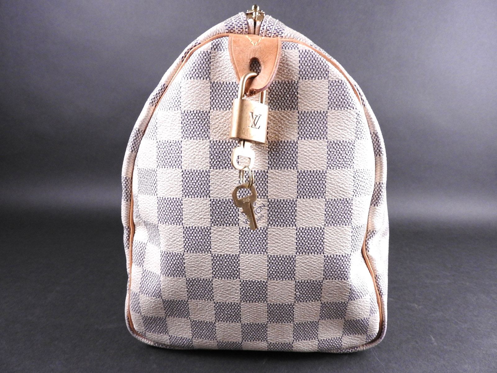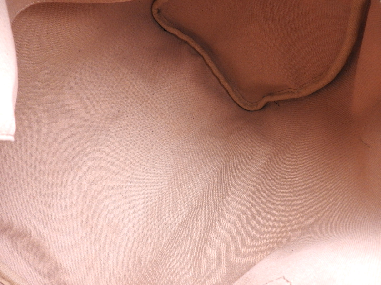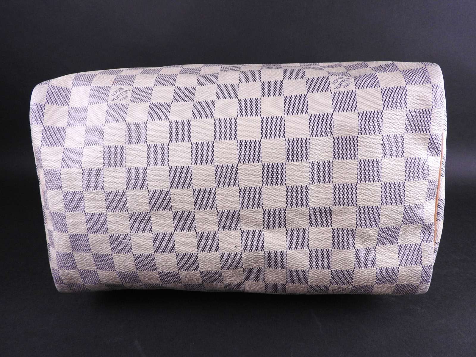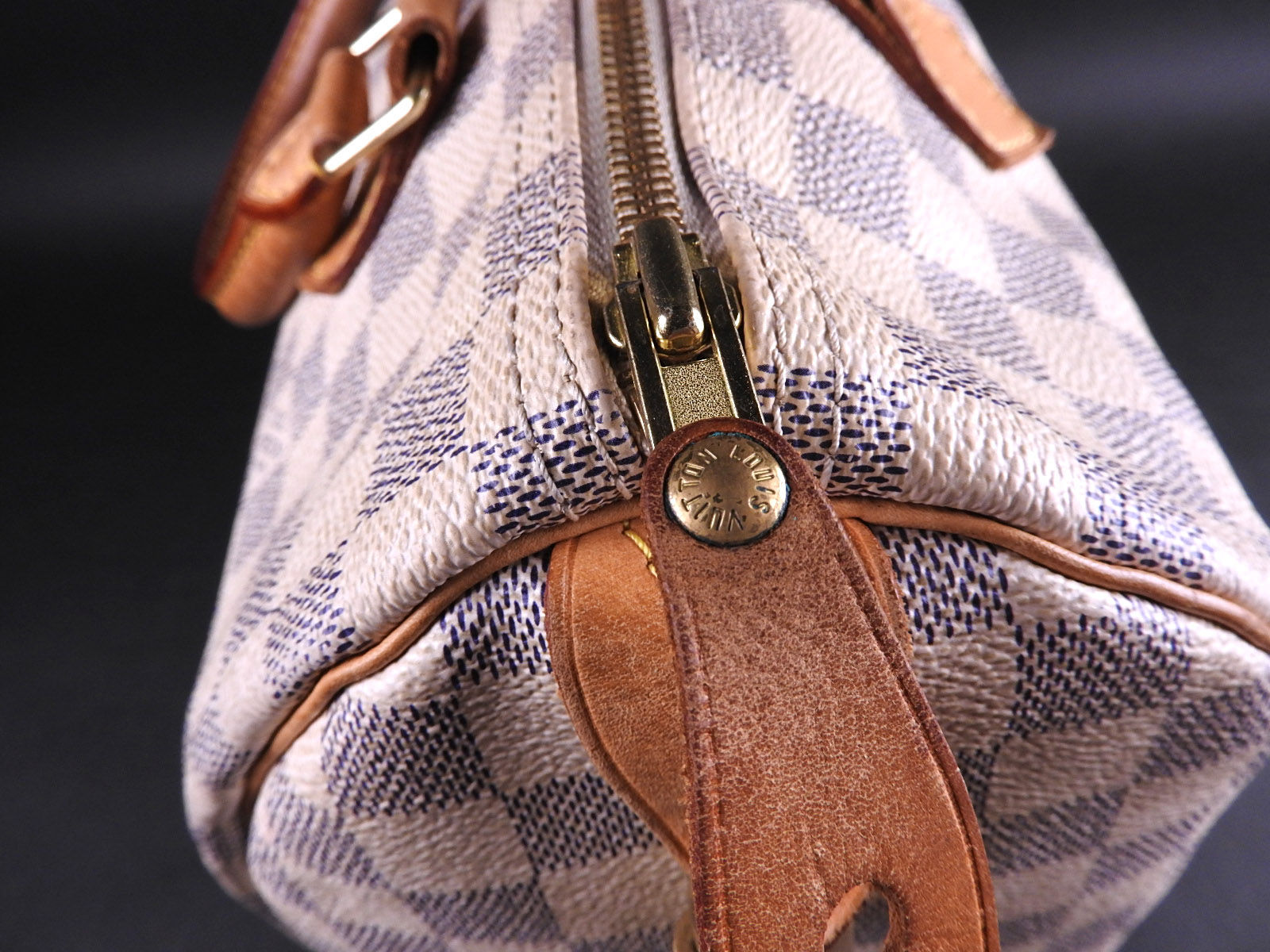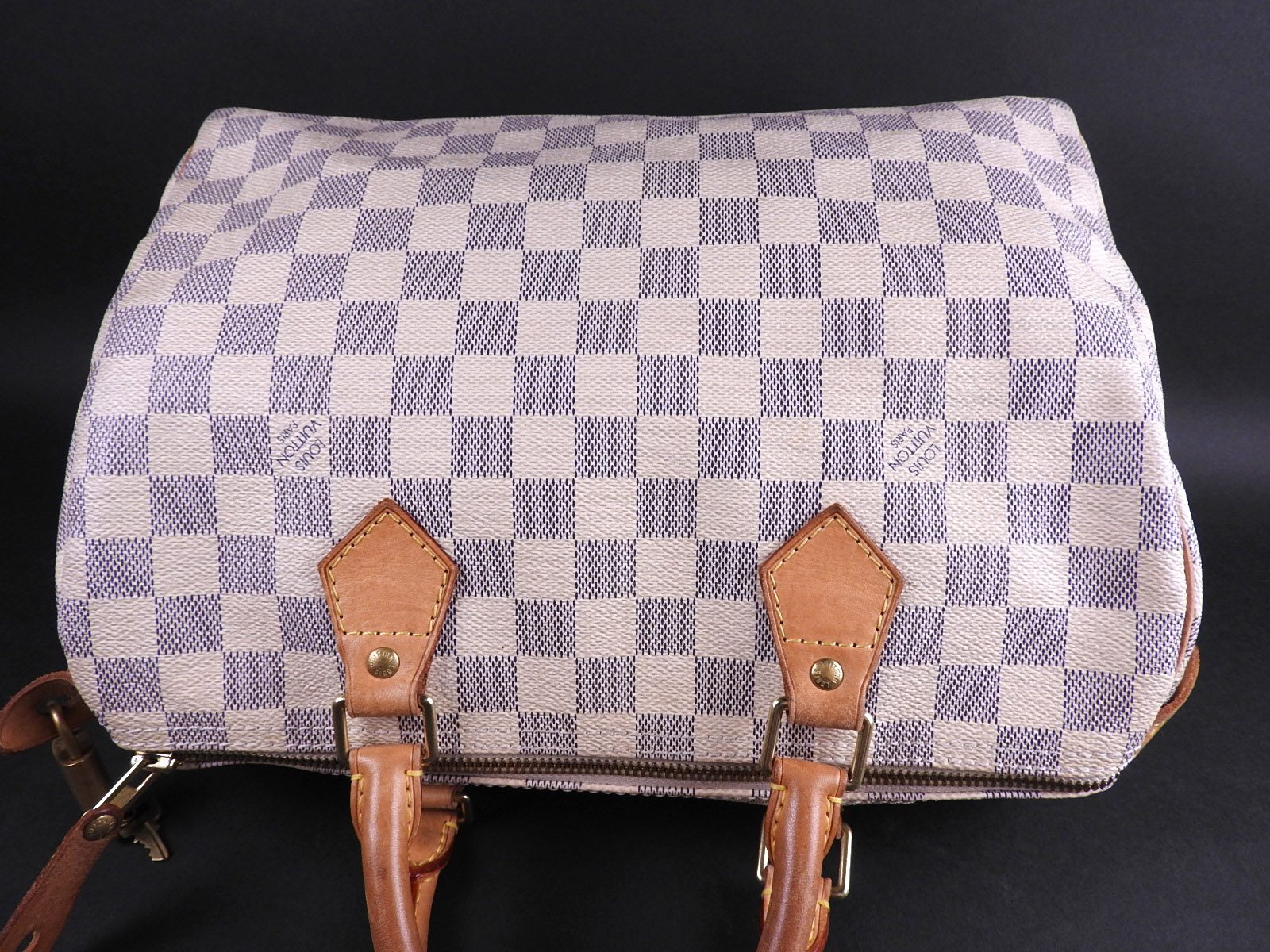 Damier Azur canvas: Used feeling. Some stains and fading. Leather: Used feeling. Some stains, wrinkles, abrasions and tanning. |