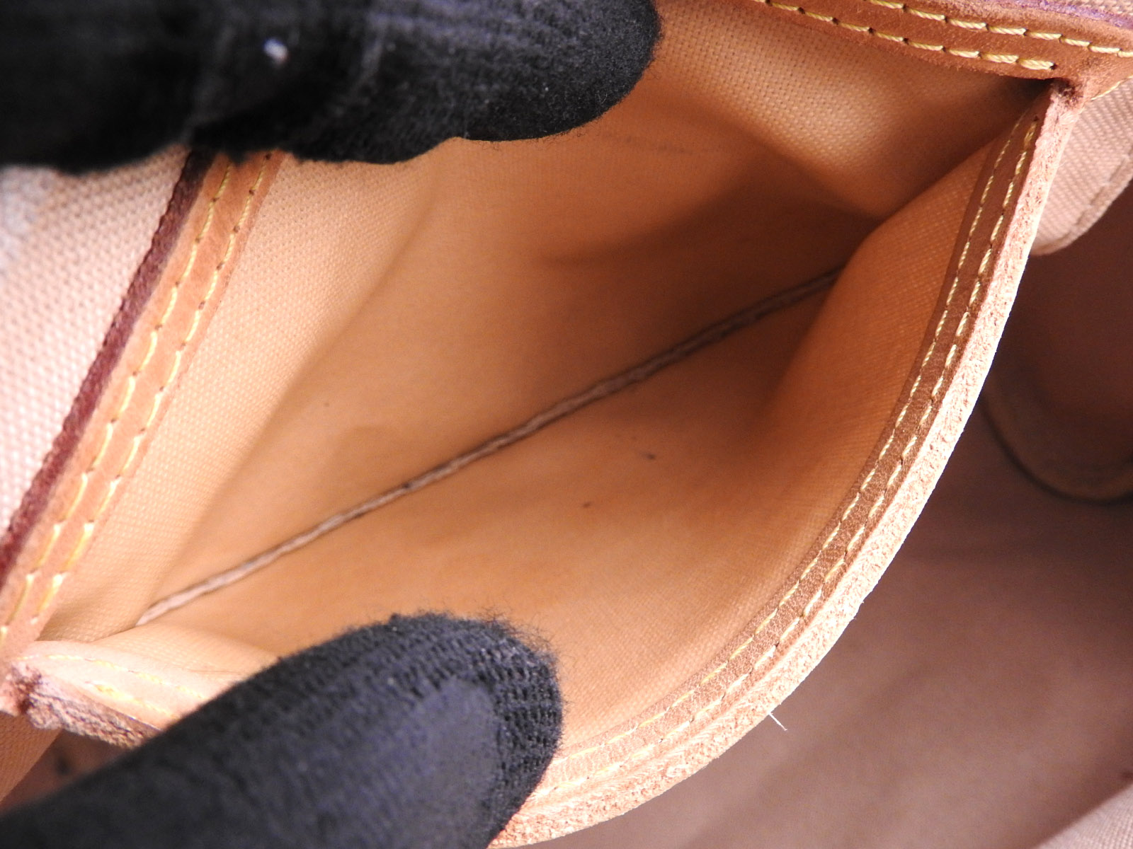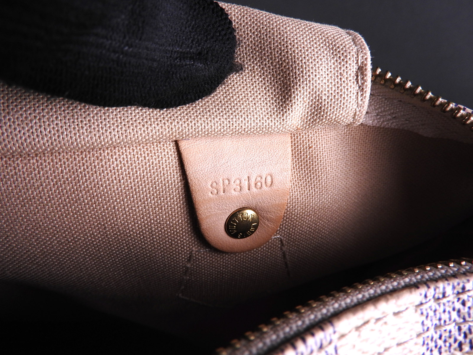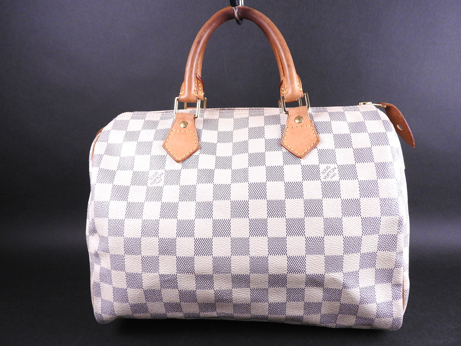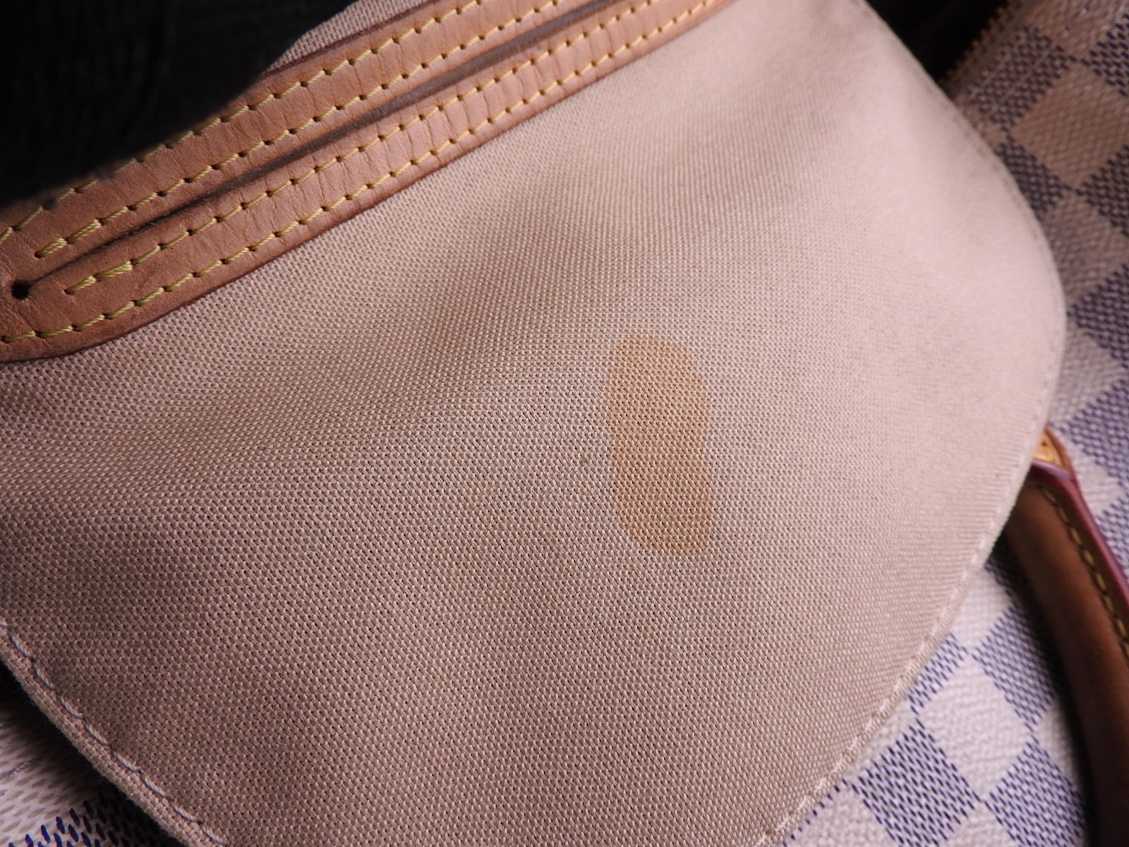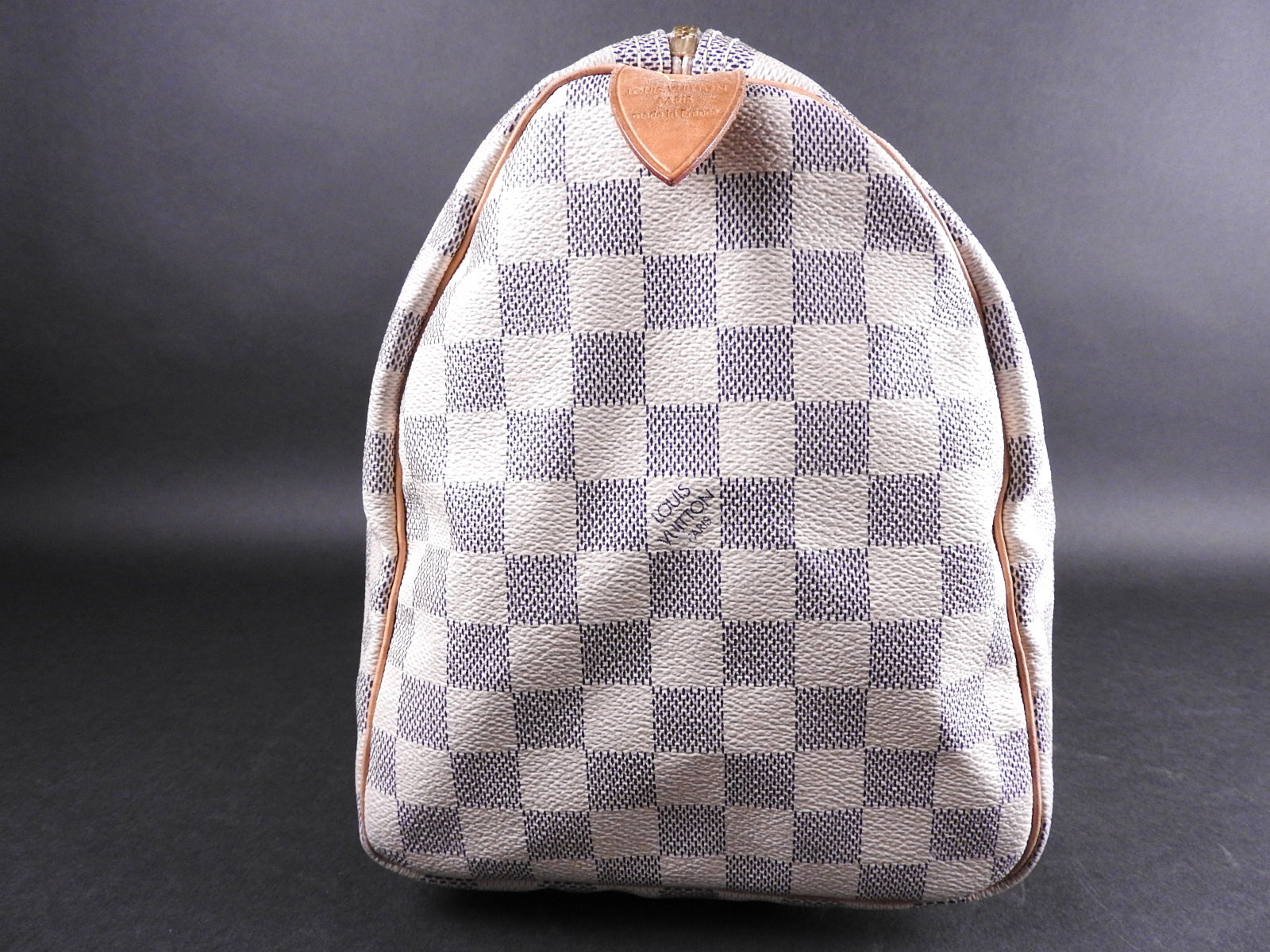 Damier Azur canvas: Used feeling. Some stains and fading. Leather: Used feeling. Some stains, wrinkles, abrasions and tanning. |