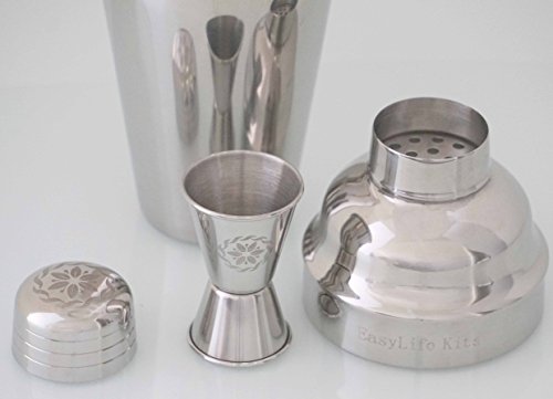 COCKTAIL SHAKER / MARTINI SET, 24 OUNCES, BUILT-IN STRAINER, DOUBLE SIZE 1 AND 1/2 OUNCE JIGGER, STAINLESS STEEL KIT, FREE (E-BOOK) COCKTAIL RECIPES