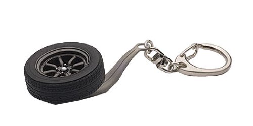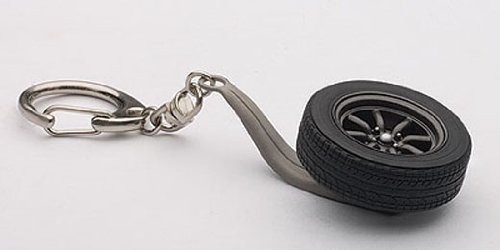 Key chain with motif of 8 spoke wheel of classic design.