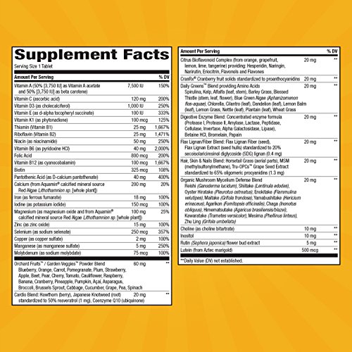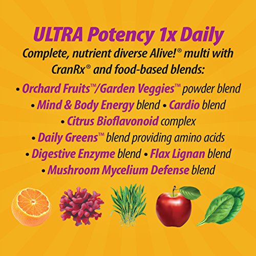 Alive™ Once Daily Women's Multi Ultra Potency is one of the most potent and complete multivitamins for women available today. Just take a look at all the nutrition packed into each tablet: 25 vitamins and minerals; 24 fruits and veggies; 18 amino acids; 12 digestive enzymes; 14 green foods; 12 organic mushrooms; and over 40 antioxidant sources! Alive offers whole body nourishment for bones, skin, muscles, joints, digestion, immune system, heart, vision, nerves, cellular energy and metabolism. And because it's a formula for women, Alive utilizes specialized herbs and nutrients like vitamins D and K for added bone and breast health support; extra biotin and horsetail for hair, skin and nails; and a special cranberry ingredient for urinary tract health.Feature