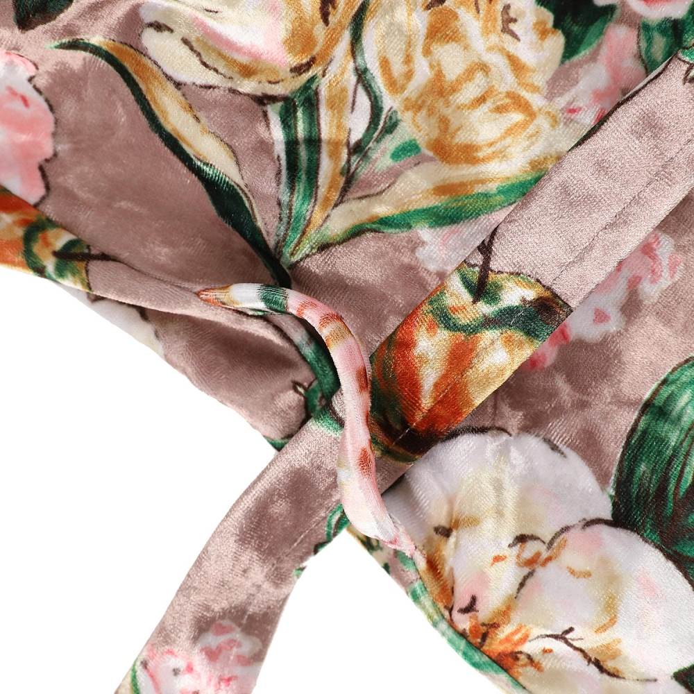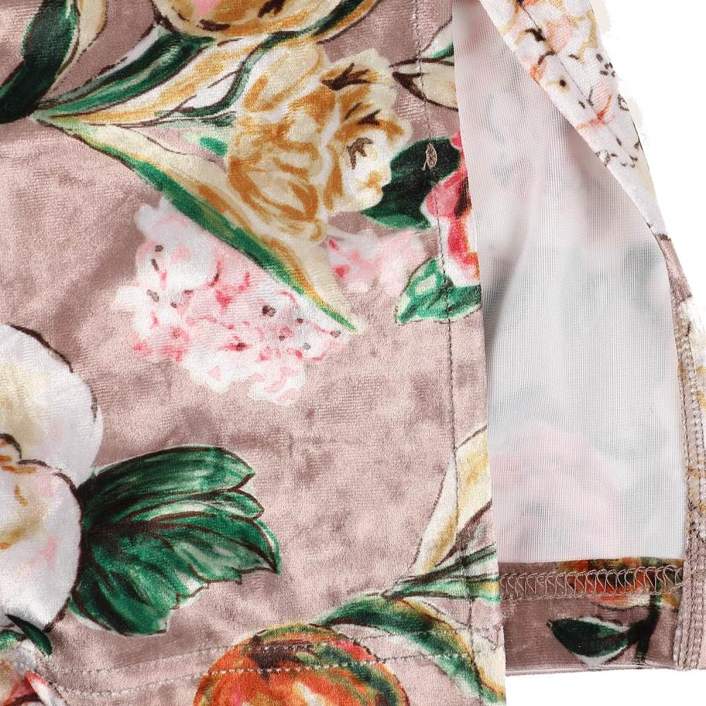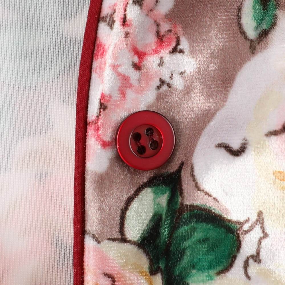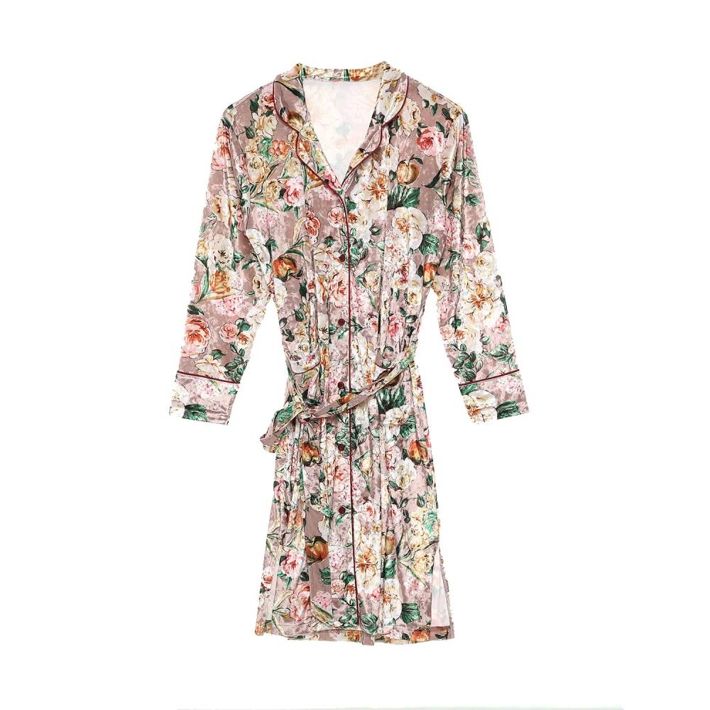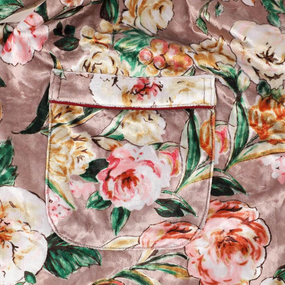 화려한 장미 나염의 벨벳소재로 디자인된 윈터 실내 원피스.