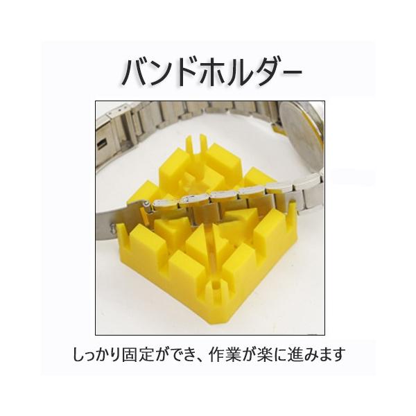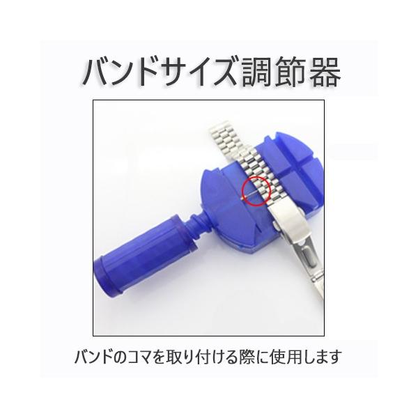 これまで時計屋さんに頼むしかなかった電池交換・バンド調整などが自分でできます!使いやすく、必要なものだけを厳選したキャリーケース付きのセットです!引き出しの奥にしまい込んである時計を修理してみませんか?[セット内容]1.プラスチック保持機2.バネはずし3.プラスドライバー(大)4.プラスドライバー(小)5.スクリュー用裏蓋はずし6.ステンレスハンマー7.メタルバンド用コマはずし8.プライヤー9.バンドピン抜棒110.バンドピン抜棒211.バンドピン抜棒312.ピンセット13.こじあけ工具14.精密ドライバー115.精密ドライバー216.精密ドライバー3※説明書は付属しません。※本製品を使用する事により発生したすべての事故、損傷、破損、損害等に関して弊社では責任を負いかねます。※使用後の交換、返品、返金は承りかねます。※輸入品の為、多少のサイズの誤差、汚れ、スレ等があるなどがある場合がございます。※入荷時期により形状、色等、多少仕様が異なる場合がございます。※詳細な使用方法について弊社ではサポート致しかねます。
