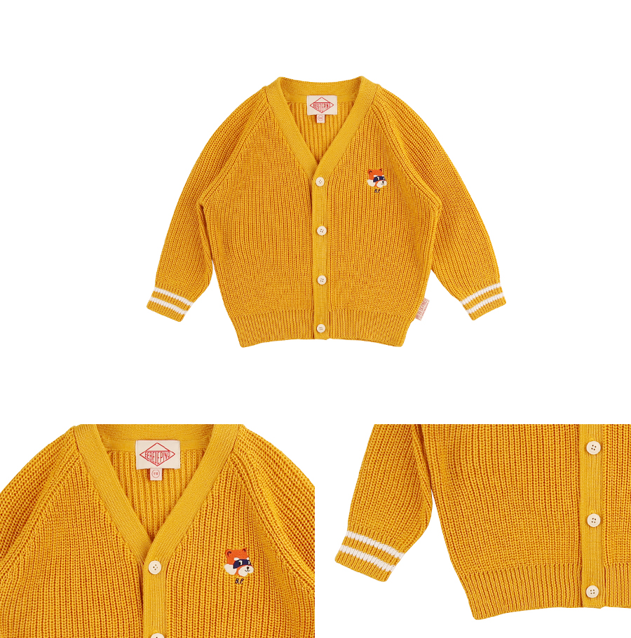 베베드피노의 레서판다 브이넥 가디건입니다. Mustard 컬러의 Cotton 혼방 소재를 사용하여 착용감이 편안합니다. 소프트한 조직으로 착용 시 실루엣을 살려줍니다. 정면에는 레서판다 자수를 장식하여 베베드피노만의 특별함을 더하였습니다. 남/여아 구분없이 착용 가능한 유니섹스 아이템으로 다양하게 활용 가능한 멀티 아이템입니다.