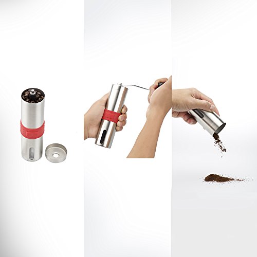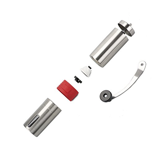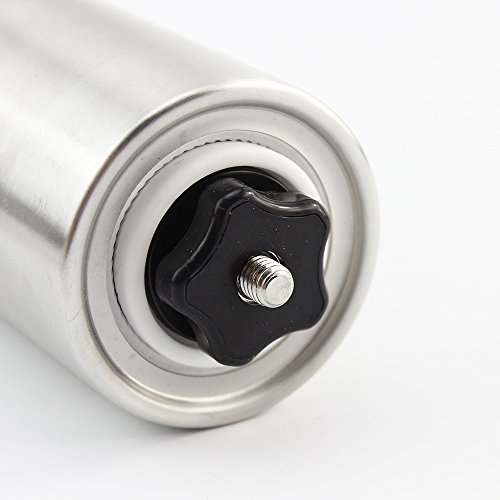 STAINLESS STEEL, REMOVABLE HAND CRACK, CERAMIC GRINDER with BOUNUS ACCESSORIES. Constructed of 304 brushed stainless steel with a heavy duty extra-long hand crank. Its Ceramic grinder last 6 times longer than stainless steel blades. Moreover, they are quieter when working compared with metal burrs, and will keep the original flavor of the coffee bean. The grinder comes with bonus coffee scoop and a pouch
