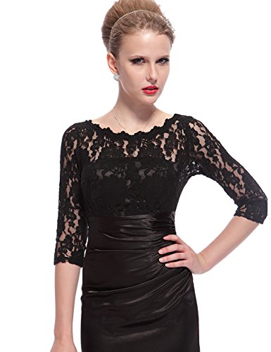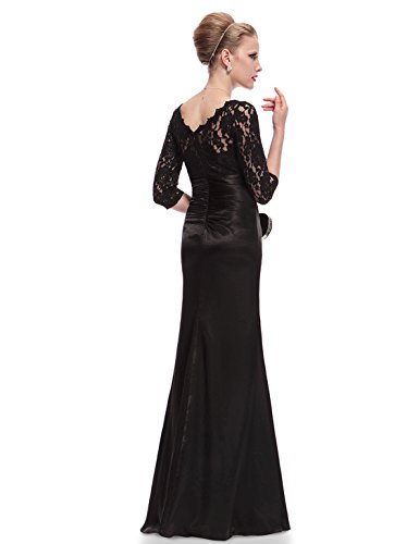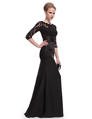 This stunning evening dress features a figure flattering ruched satin waist and a 3/4 sleeve lace bust. The formal floor length of the dress coupled with the classic black color makes this dress perfect for any black tie affair; it has also been very popular with mothers of the bride and groom.Feature
