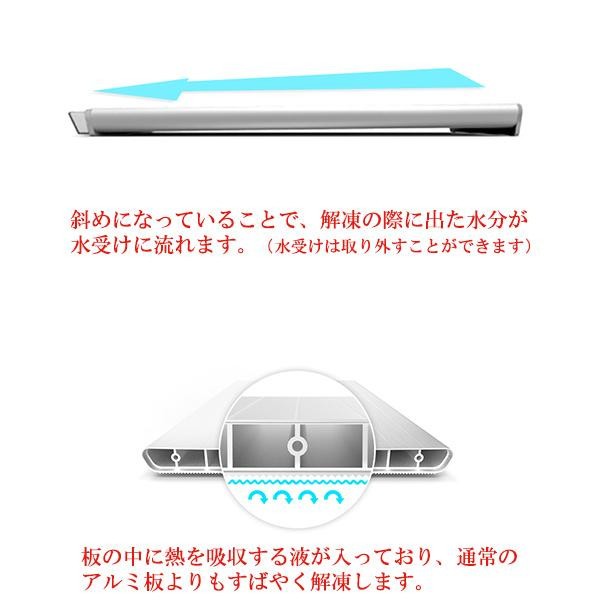 | 解凍ボードの中には熱を吸収する液体が入っています アルミ板では吸収する温度に限界があるところ この液体がさらに冷たい温度を吸収する力を持ち 自然な急速解凍を実現します ボードは緩やかな斜面になっており 解凍時に出る水分を受ける水受けが付いています シンプルなデザインでキッチンをおしゃれに演出します |