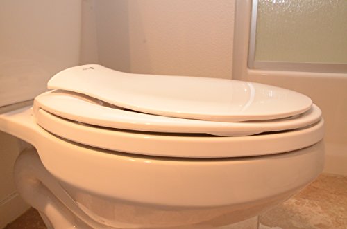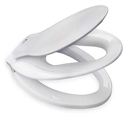 Durable injection molded toilet seat with high strength plastic and slow close cover resists chipping and scratching. Solid plastic potty seat is long lasting and stain resistant.