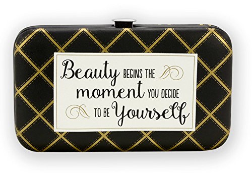 - Case features black and gold pattern exterior and black fabric interior; message reads: beauty begins the moment you decide to be yourself