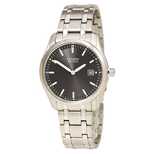 -. Feature : Light-powered Eco-Drive watch featuring black sunray dial with stick markers and date window at three o'clock / 38 mm silver-tone case with mineral dial window / Japanese quartz movement with analog display / Stainless steel bracelet with fold-over-clasp closure / Water resistant to 30 m (99 ft)
