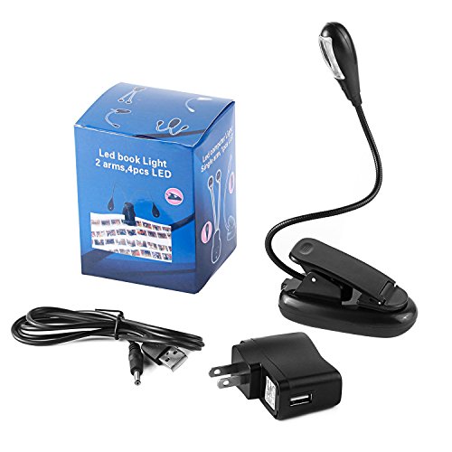 Book Light for Reading In Bed, PEMOTech 4 LED Clip On Reading Light, Portable and Flexible 2-Level Brightness Rechargeable Travel Light with USB Cable & AC Adapter for Desk, Music Stand, Bed
