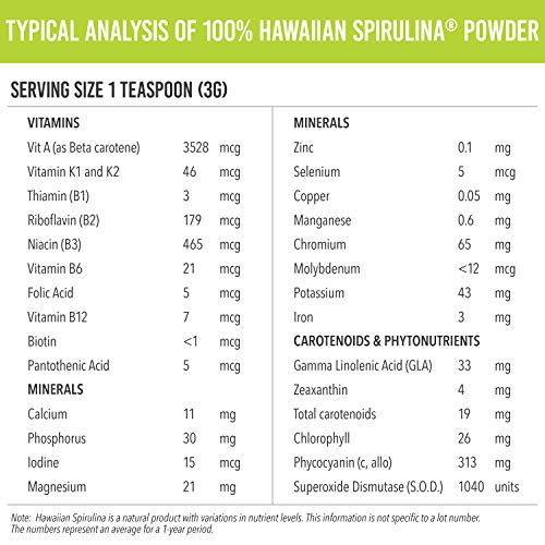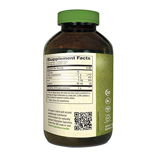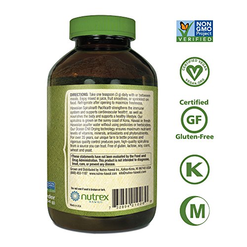 Hawaiian Spirulina is a blue-green microalgae, Arthrospira platenesis, which is grown naturally under the intense Hawaiian sun on the Big Island of Hawaii. It naturally contains protein, iron, beta carotene, minerals, vitamin B12, zeaxanthin, chlorophyll, and phycocyanin. One 3 gram serving has higher levels of some key antioxidants, enzymes, and minerals compared to 5 servings of fruits and vegetables. Ideal for vegans. · Nutrex Hawaii, founded in 1999, is the leading producer of natural microalgae supplements from Hawaii. Farm to Bottle, we control the cultivation, harvest and processing of our Hawaiian Spirulina and BioAstin Hawaiian Astaxanthin microalgae products. We are GMP (Good Manufacturing Practices) third-party certified. All of our products are pesticide and herbicide free, non-GMO, free of gluten, soy, lactose, and preservatives.Feature