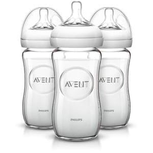 Three 8-ounce Natural Philips Avent glass bottles, three slow-flow nipples, and three bottle caps.