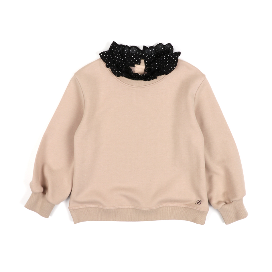 목의 도트패턴의 프릴단 처리가 에스닉한 느낌을 주는 유니크한 티셔츠 아이템입니다.