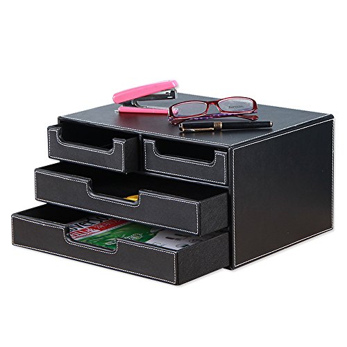 Smonet Multi-Functional 4 Small Drawers PU Leather Desk Organizer File Collection Cabinet Office Supplies Desktop Storage Jewelry Organizers Stationery Box with Drawer (Black)