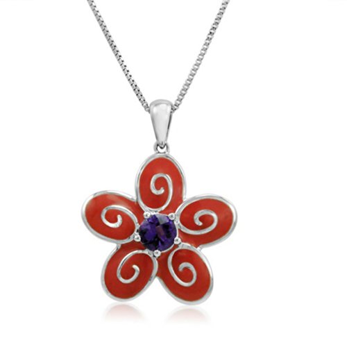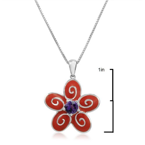 -. Title : Sterling Silver Enamel and Amethyst Flower Pendant-Necklace on an 18in Box Chain