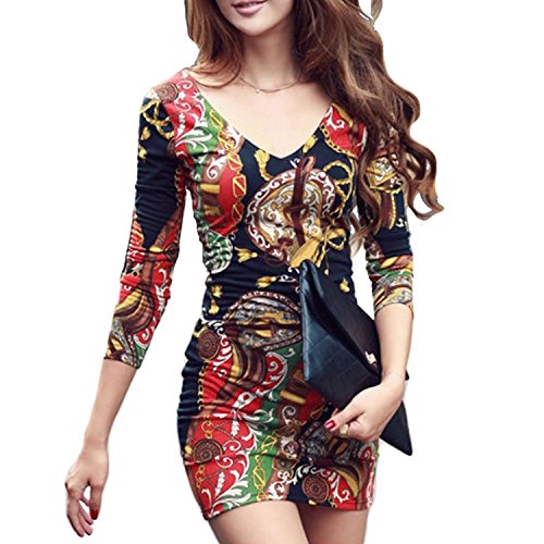 -. Feature : ゴージャスなスカーフ柄が全面にプリントされていて、インパクト抜群なミニワンピースです。エレガントな花柄が大人セクシーな感じで、周囲の視線を奪えます! 華やかなパーティーのドレスとしても、これ1着でOK!! / デコルテを綺麗にすっきり見せるVネックデザイン。バックスタイルもVネック仕様なので、セクシーで大人っぽい印象にスタイルアップ。七分袖で使い易いアイテムなのでジャケットと合わせてアレンジすれば季節を問わずご利用いただけます。 / サラサラ感のある柔らかいストレッチ 素材を使用しており、着心地と肌触りが抜群で動きやすいのがポイントです。シワにならないので、イザという時のために、小さく折りたたんでバッグやポーチの片隅に着替え用として忍ばせて置くこともできますよ。シンプルなスタイリングでボディにフィットし、スリムで綺麗なS字ラインのタイト シルエットを引き立てます。 / レギンスやパンツと合わせてチュニック・トップスとしても着回しができる優れものです。幅広のベルトでウェストマークをつけてアレンジすると印象が締まってエレガンスさがアップ! 美ラインが引き立ちます。ロング丈のカーディガンやライダースーツとの相性も良いミニワンピは、一枚で着るのは勇気がいるという方でも、アウターと合わせることで安心して着ることができます。 / 素材:レーヨン、コットン、ポリエステル  ※生地の取り方により、柄の位置が写真とはずれることがあります。また伸縮性はありますが、次のサイズ表でご確認ください。<Sサイズ>:肩幅33㎝ 身幅36㎝ ウェスト65㎝ 着丈75㎝ 袖丈54㎝ <Mサイズ>:肩幅34㎝ 身幅37㎝ ウェスト66㎝ 着丈76㎝ 袖丈55㎝ < Lサイズ >:肩幅36cm 身幅38cm ウェスト67㎝ 着丈77㎝ 袖丈57㎝ <XLサイズ>:肩幅39㎝ 身幅40㎝ ウェスト70㎝ 着丈78㎝ 袖丈58㎝