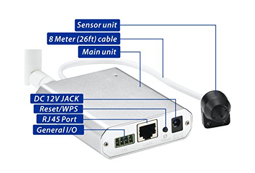 -. Feature : Ultra discreet network camera, with its miniature size design which enables easy integration into any hidden place. Almost impossible to discover, which keeps it protected from vandalism. Works over Wi-Fi, Ethernet or Power over Ethernet (PoE) 802.3af. WPS support for easy wireless setup. / 8 meter (26ft.) cable, providing maximum flexibility to place the sensor unit and the main unit. Quick installation with Power over Ethernet. / General I/O which is used to connect external alarm devices like PIR sensor, Gas Detector and etc. Audio line in for security sound monitor pickup device. / Multi-zone Motion Detection and adjustable sensitivity, alerts by Email or Push Notifications (for iOS and Android). / Built-in Micro SD card Slot up to 128GB (SD Card not included) with remote playback from anywhere. Free iPhone, Android Apps for Quick & Easy remote Viewing.
