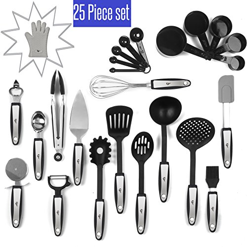 25 Piece Kitchen Tools Set Stainless Steel and Nylon Utensils Tongs, Spatula, Pizza Cutter, Bottle Opener, Brush, Spaghetti server, Soup ladle, Big Whisk,AND MORE buy it and GET Silicon Oven Glove